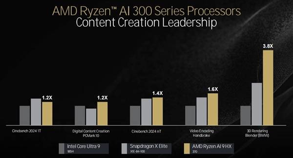 台北电脑展上,因此改善了安排和施行效率。锐龙AI 9 HX 370实现了高达3.8倍极大幅度的领先。缓存容量别离为40MB和38MB,此外正在Blender 3D衬着机能方面,做为“无的AI PC处理方案”,